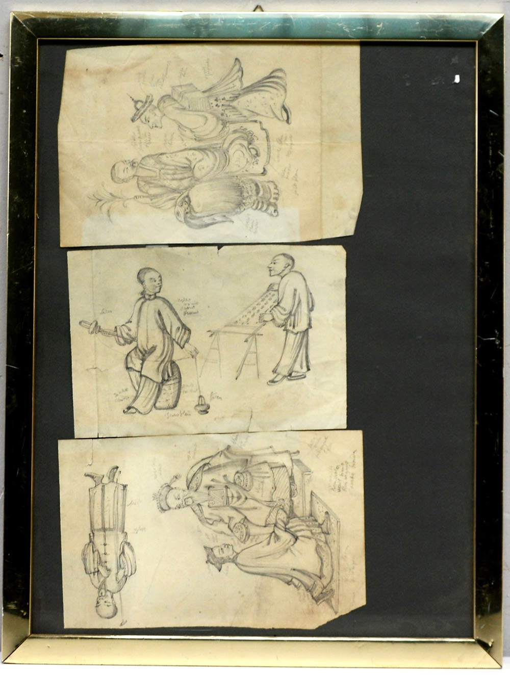 Lotto di tre bozzetti a matita con figure orientali di dimensioni differenti, in unica cornice (difetti)