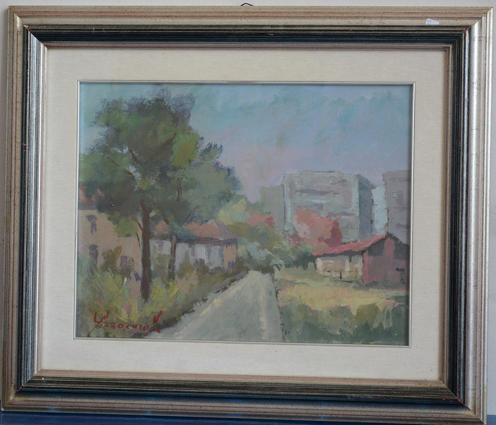 Gianfranco Pizzocaro "Periferia di Milano" olio su cartone telato (cm 35x45) firmato in basso a sinistra. Etichetta al retro, in cornice