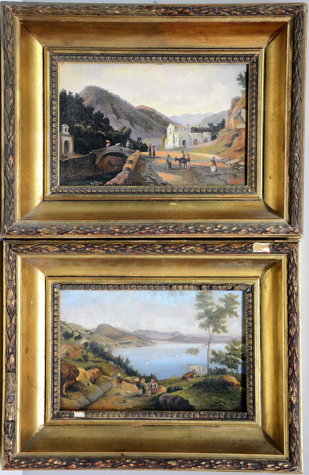 Firma indecifrata, "Paesaggi", coppia di olii su cartone pressato (cm 20x30) firmati in basso, in cornici (difetti)