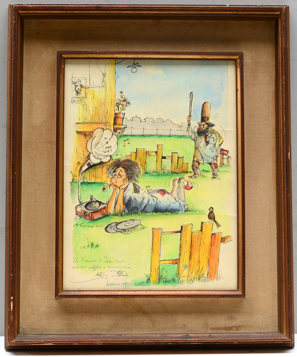 Marino "Scena caricaturale" 1973, tecnica mista su carta (cm 40x30) firmata, datata e dedicata in basso a sinistra. In cornice (lievi difetti)