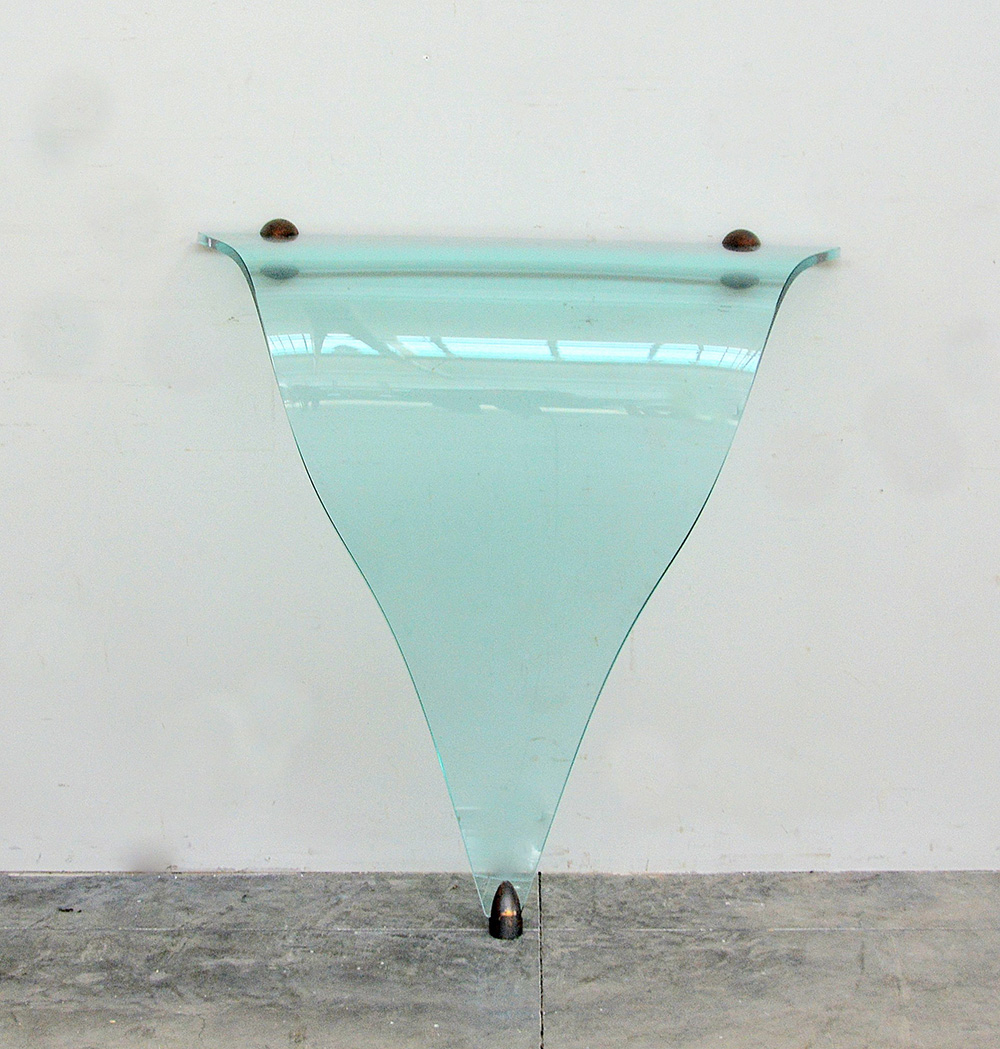 Consolle in cristallo curvato e molato di forma sagomata, borchie di fissaggio in ottone e metallo (cm 90) Firmata e datata Nicoletti pom Sova 1991 sul fianco sinistro