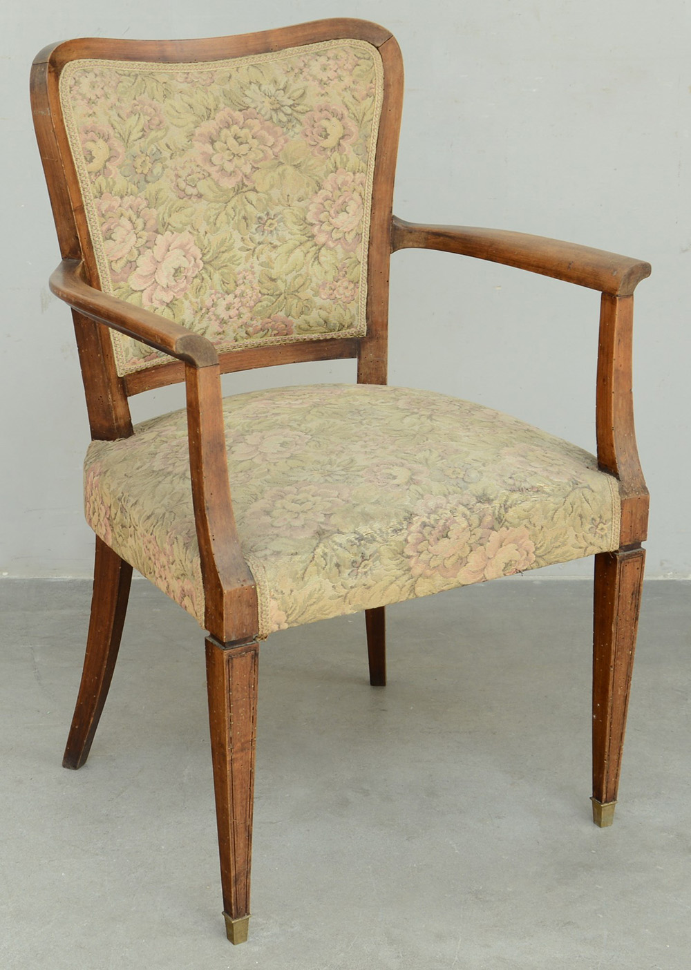 Poltrona con gambe anteriori rastremate, seduta e schienale ricorperti da tessuto operato (difetti)