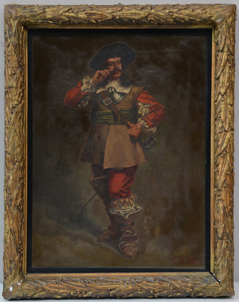 Firma indecifrata, "Il moschettiere", olio su tela (cm 41x30,5) firmato in basso a destra, in cornice (difetti e restauri)
