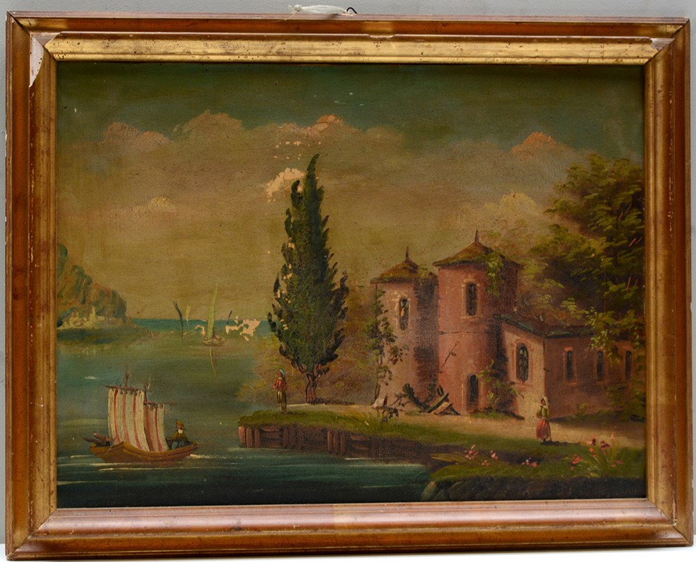 Lotto 2202 | Ignoto "Paesaggio fluviale" olio su tela (cm 43x58). In cornice (gravi difetti)