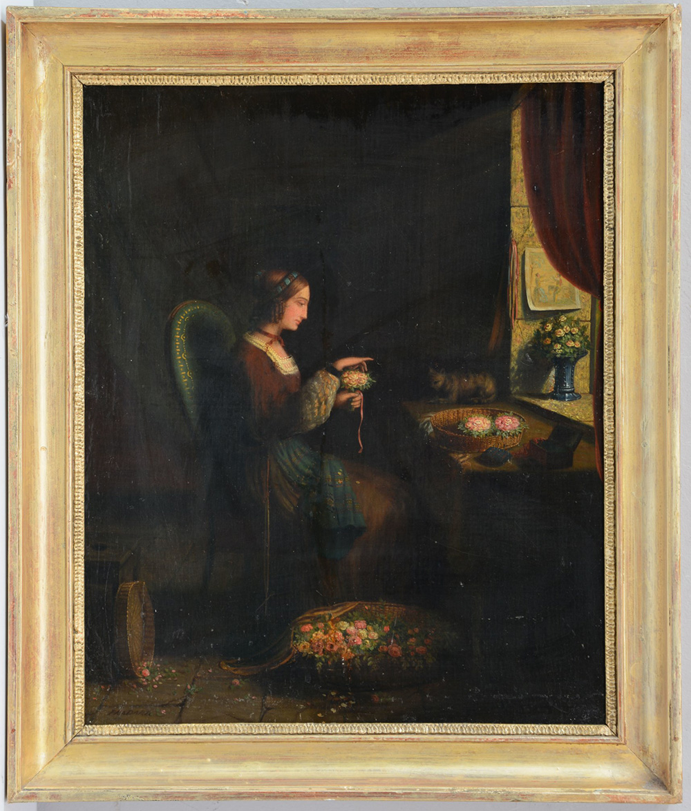 Scuola del sec. XIX "La fioraia", olio su tavola (cm 45,5x37) in cornice (difetti e restauri)