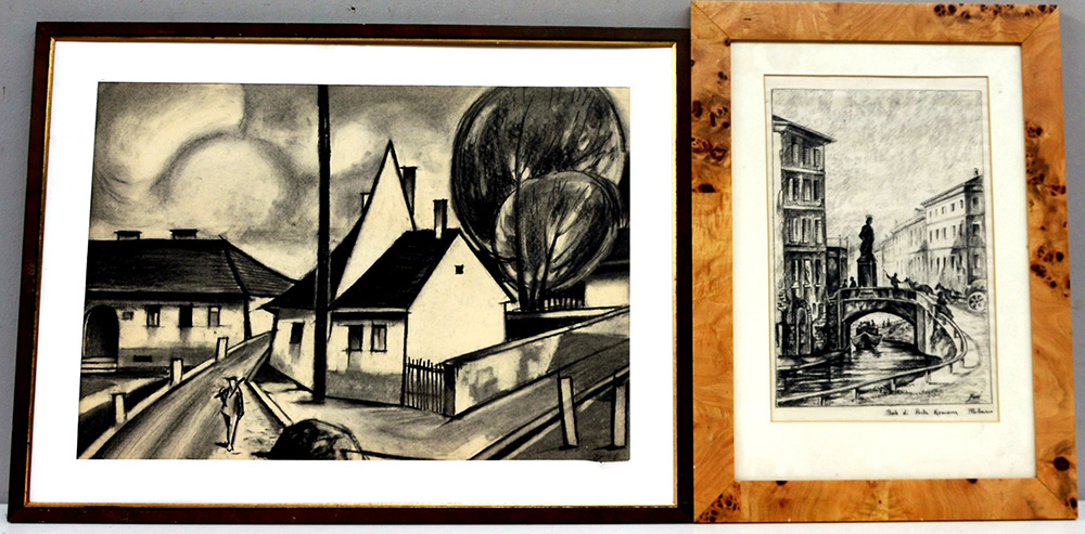 Lotto di due disegni, a gessetto e matita grassa, raffiguranti scorci di citt‡ (cm 42x60 e 38x25), in cornici (difetti)