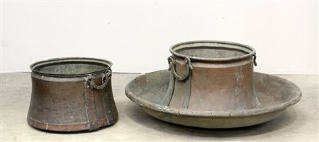 Lotto composto da due marmitte e da un grande bacile in rame (difetti)