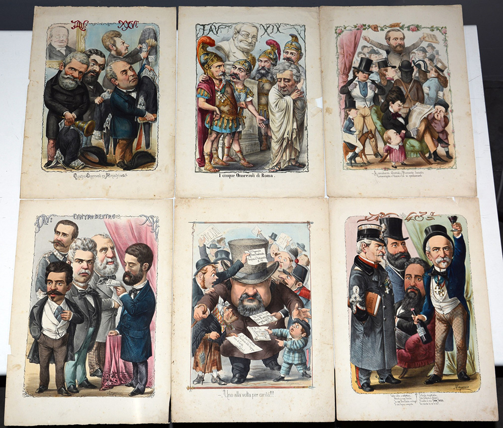 Lotto composto da sette stampe a colori raffiguranti caricature di politici italiani a cavallo tra '800 e '900 (cm 48x34) (difetti)