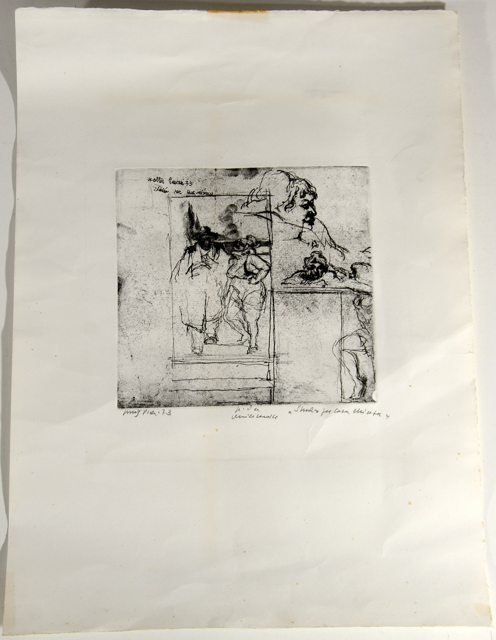 Firma indecifrata "Scena di genere" acquaforte (cm 70x50) firmata e datata '73 in basso