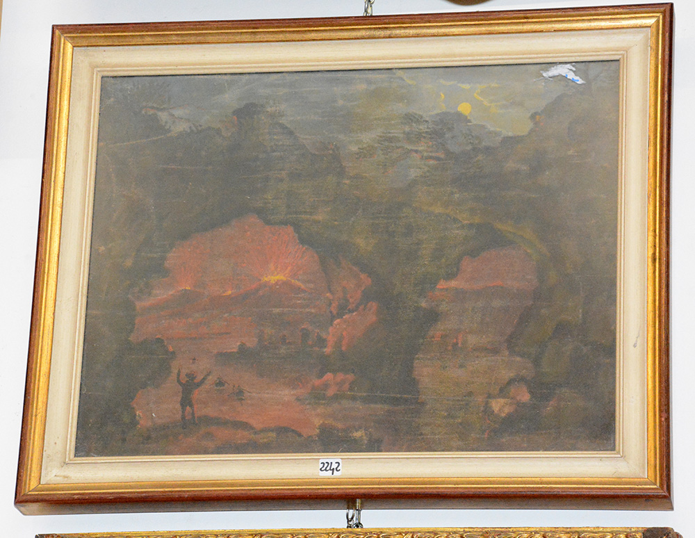 Ignoto "Paesaggio con eruzione" olio su tela applicata su pannello (cm 42x56). In cornice (difetti)