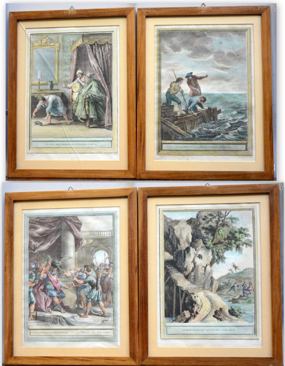 Gruppo di quattro incisioni a colori tratte dall' opera di Jean-Baptiste Oudry (cm 30,5x22). In cornici (lievi difetti)