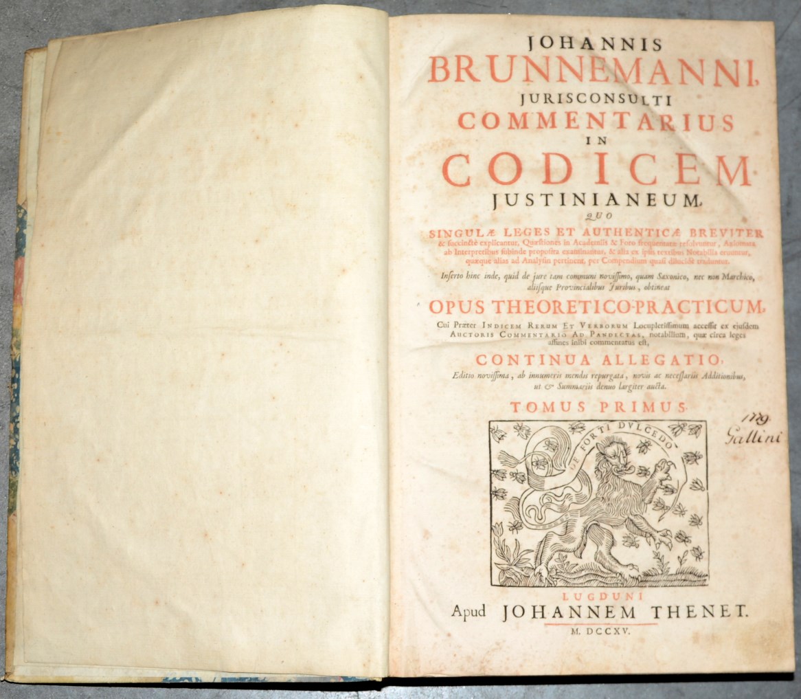 Giovanni Brunneman, Jurisconsulti Commentarius In Codicem Justinianeum. Lione: Giovanni Thenet, 1715. Vol. in folio, in legatura coeva in mezza pergamena, piatti e taglio marmorizzati (difetti)