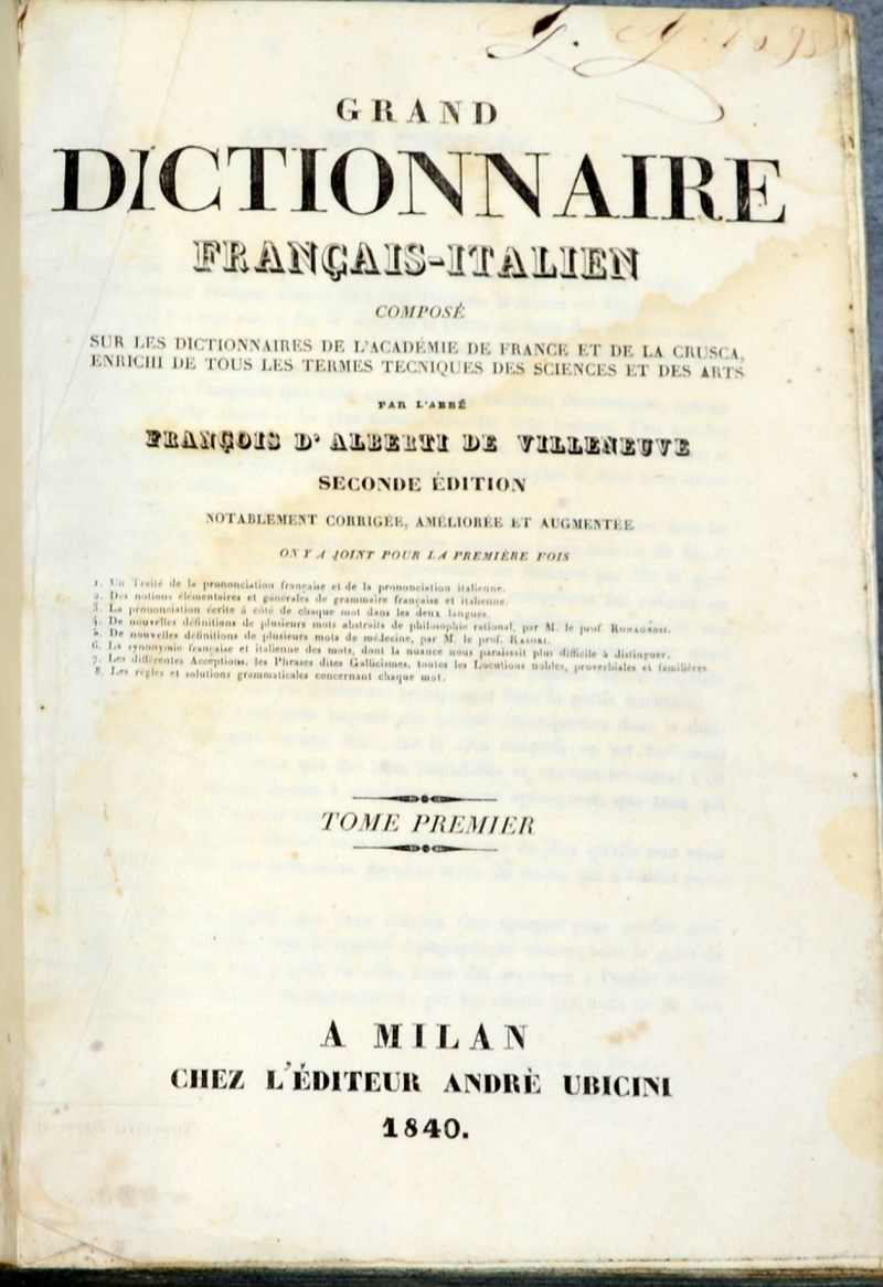 (Libri) FranÁois de Villeneuve. Grand Dictionnaire franÁais-italien. Milano: AndrÈ Ubicini, 1840. Due voll. in 4∞. Legatura moderna in mezza pelle, piatti marmorizzati e taglio azzurro. Note di possesso sul primo foglio di guardia di ciascun volume (fioriture diffuse).