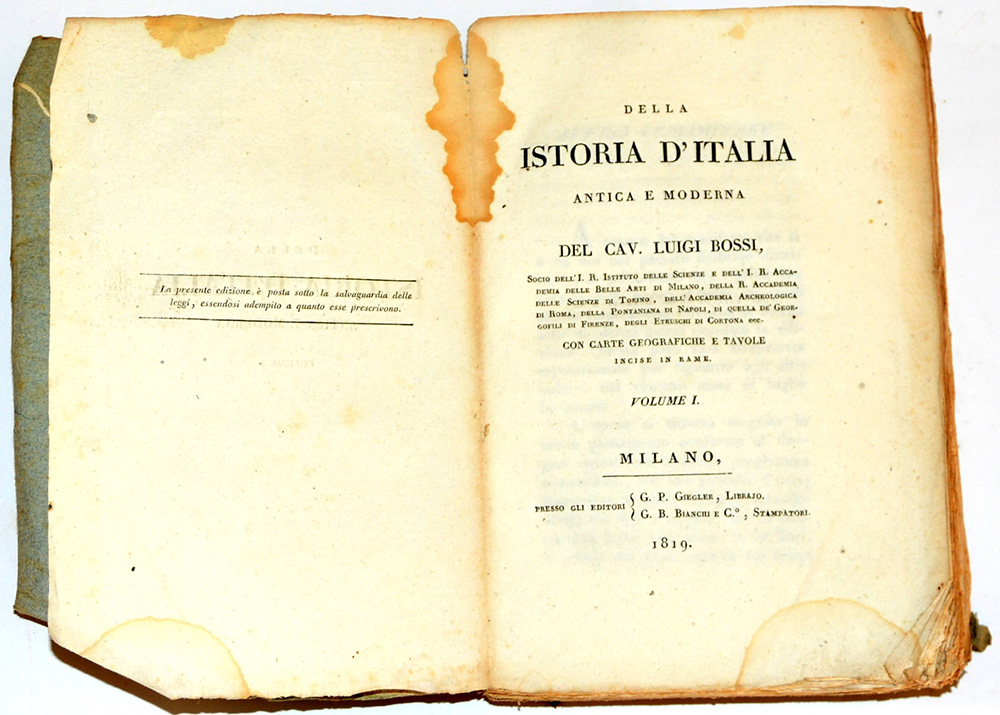 (Libri) Luigi Bossi. Della Istoria d'Italia antica e moderna... Milano, 1819-1823. 19 voll. in 8∞, contenenti incisioni in rame (legatura cartonata gravemente compromessa, gore di umidit‡ e fioriture). Lotto in cartone