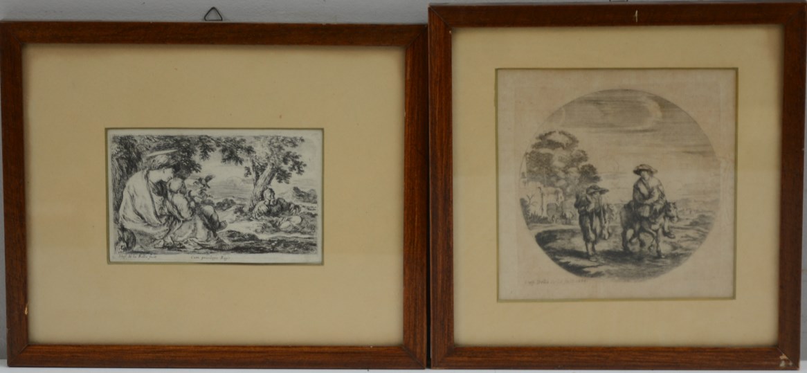 Stefano della Bella Firenze (1610- 1664) Due acqueforti raffiguranti scena religiosa e paesaggio con viandanti, una datata 1656 in basso (difetti)