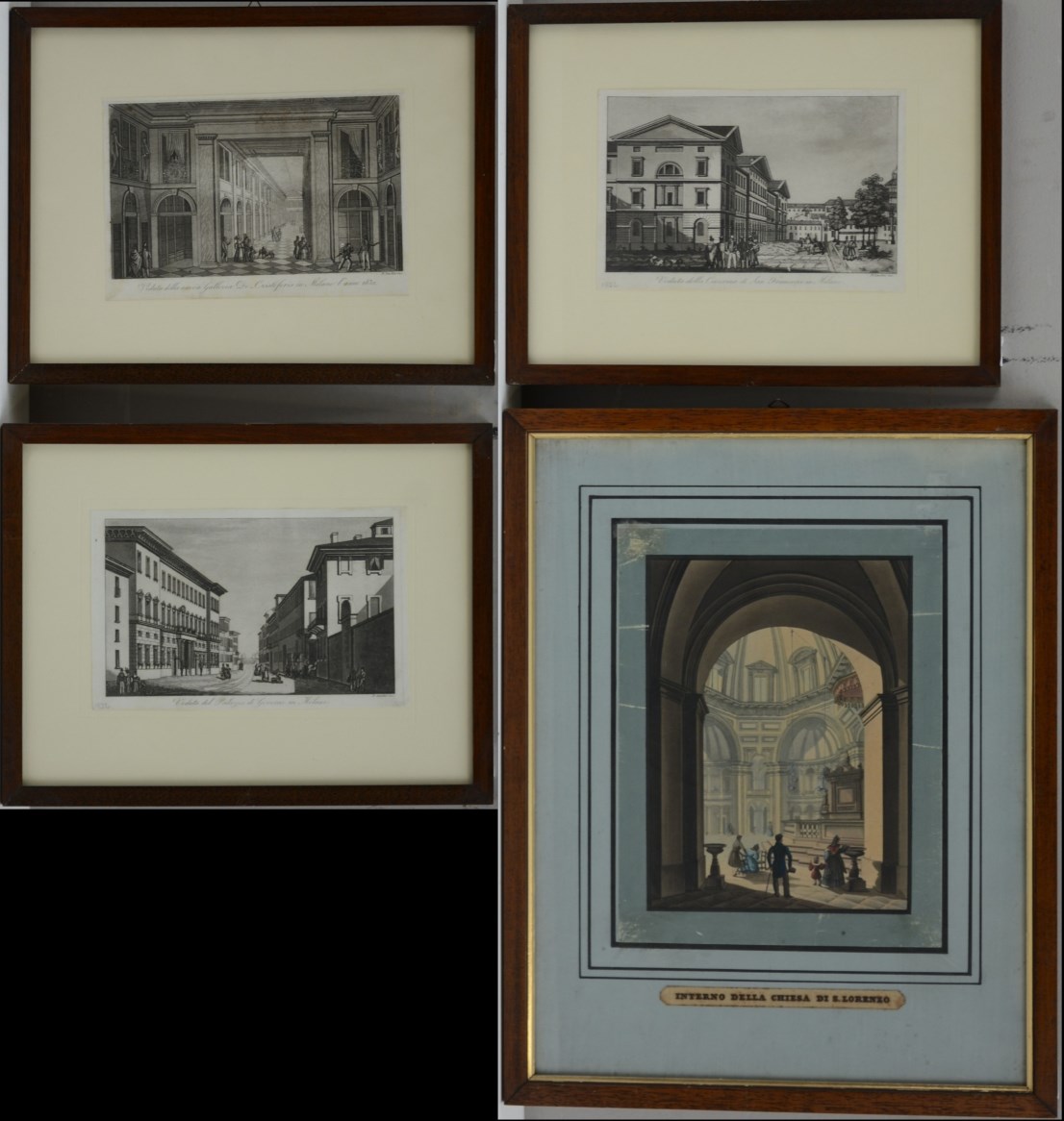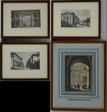 Gruppo di quattro incisioni di diversa epoca raffiguranti scorcio di Milano...