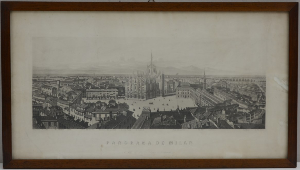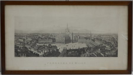 Incisione del sec. XIX a volo d'uccello raffigurante panorama di Milano (cm 31x58) (difetti)