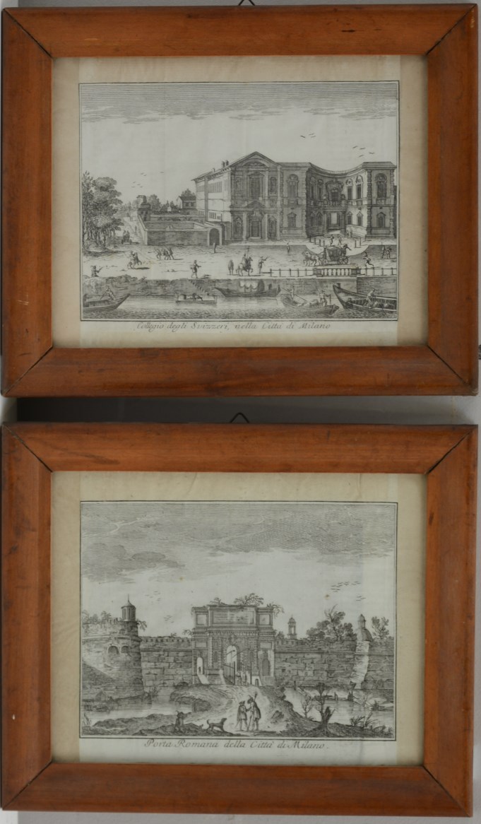 Coppia di acqueforti del sec. XVIII raffiguranti Porta Romana e Collegio degli Svizzeri di Milano (difetti e restauri)