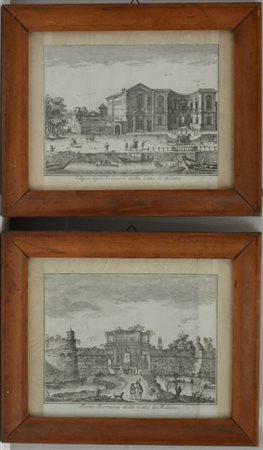 Coppia di acqueforti del sec. XVIII raffiguranti Porta Romana e Collegio...