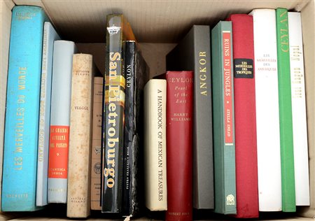 (Libri) Lotto composto da tre cartoni contenenti numerosi volumi di argomento principalmente geografico, alcuni di taglio turistico, e guide di viaggio (difetti)
