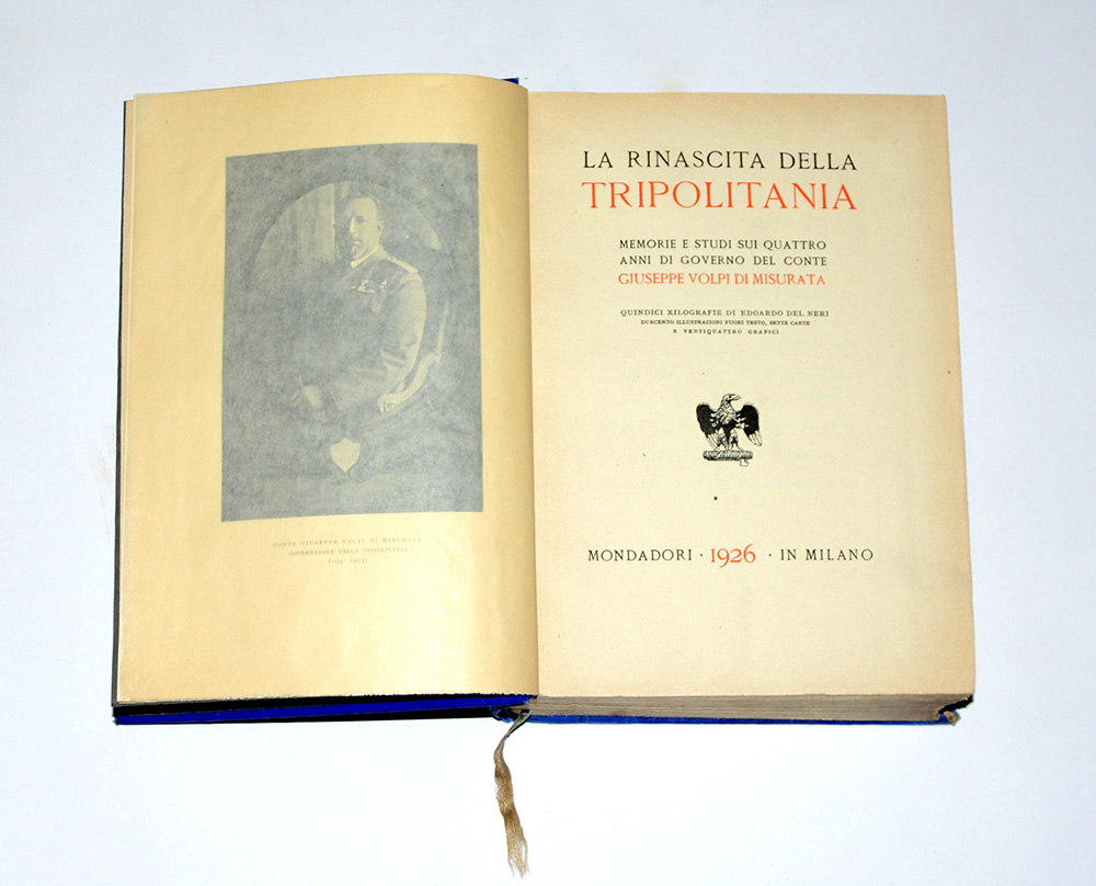 (Libri) La rinascita della Tripolitania. Memorie e studi sui quattro anni di governo del conte Giuseppe Volpi di Misurata. Milano, 1926. Vol. in 4∞, esemplare con illustrazioni, carte geografiche, grafici e xilografie. Legatura in piena tela blu con titoli impressi in oro e stemma sul piatto anteriore (difetti alla legatura)