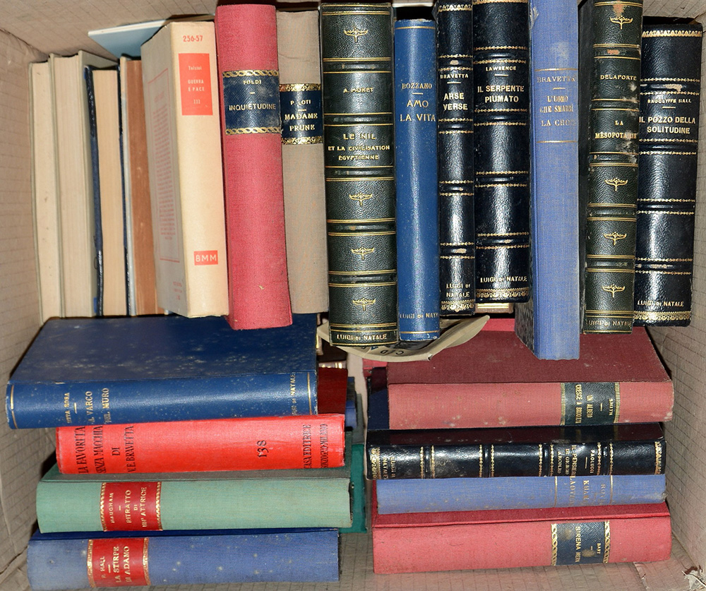(Libri) Lotto composto da tre cartoni contenenti numerosi libri di vario argomento e alcuni numeri della rivista di moda "Bellezza" (difetti)