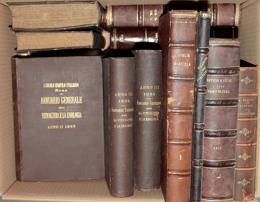 (Libri) Lotto composto da due cartoni contenenti numerose pubblicazioni di vario argomento, incentrate principalmente sull'agricoltura e l'economia rurale, edite nel sec. XIX (difetti)