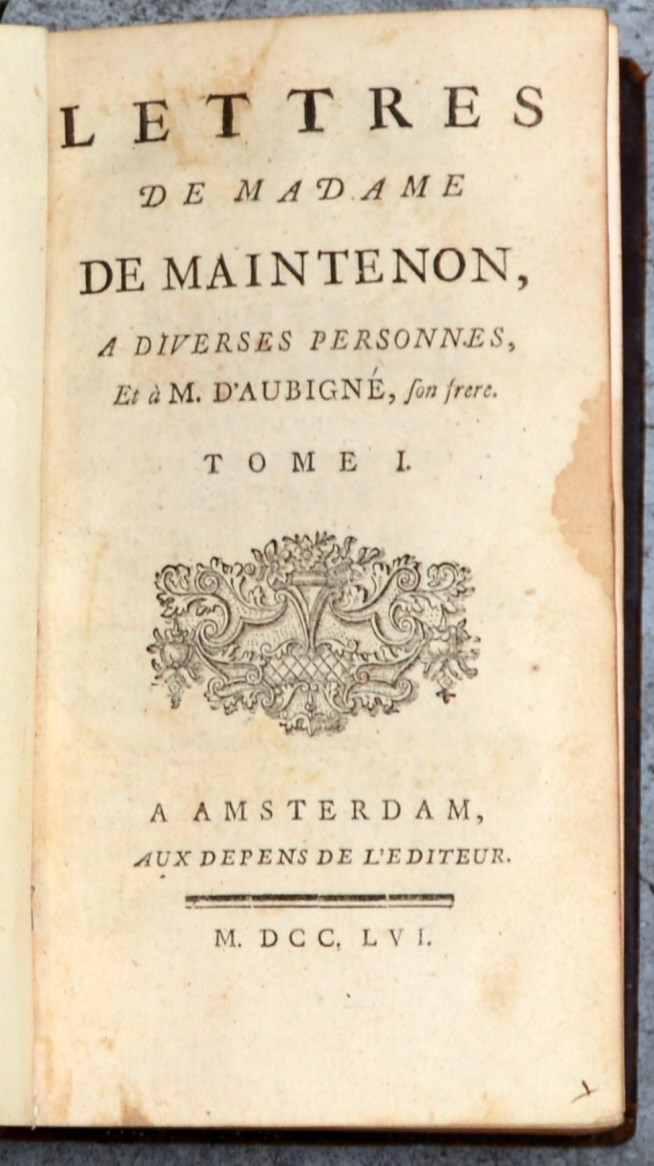 (Libri) M.me D'Aubigne Maintenon, Memoires pour servir ‡ l'histoire (6 tomi in 3 voll.) e Lettres de Madame de Maintenon a divers personnes (7 tomi in 4 voll.). Amsterdam, aux depense de l'editeurs, 1755-1756. Legatura coeva in piena pelle, con decorazioni e titoli in oro sul dorso; taglio rosso (dorso consunto, segni di tarlature, lievi bruniture)