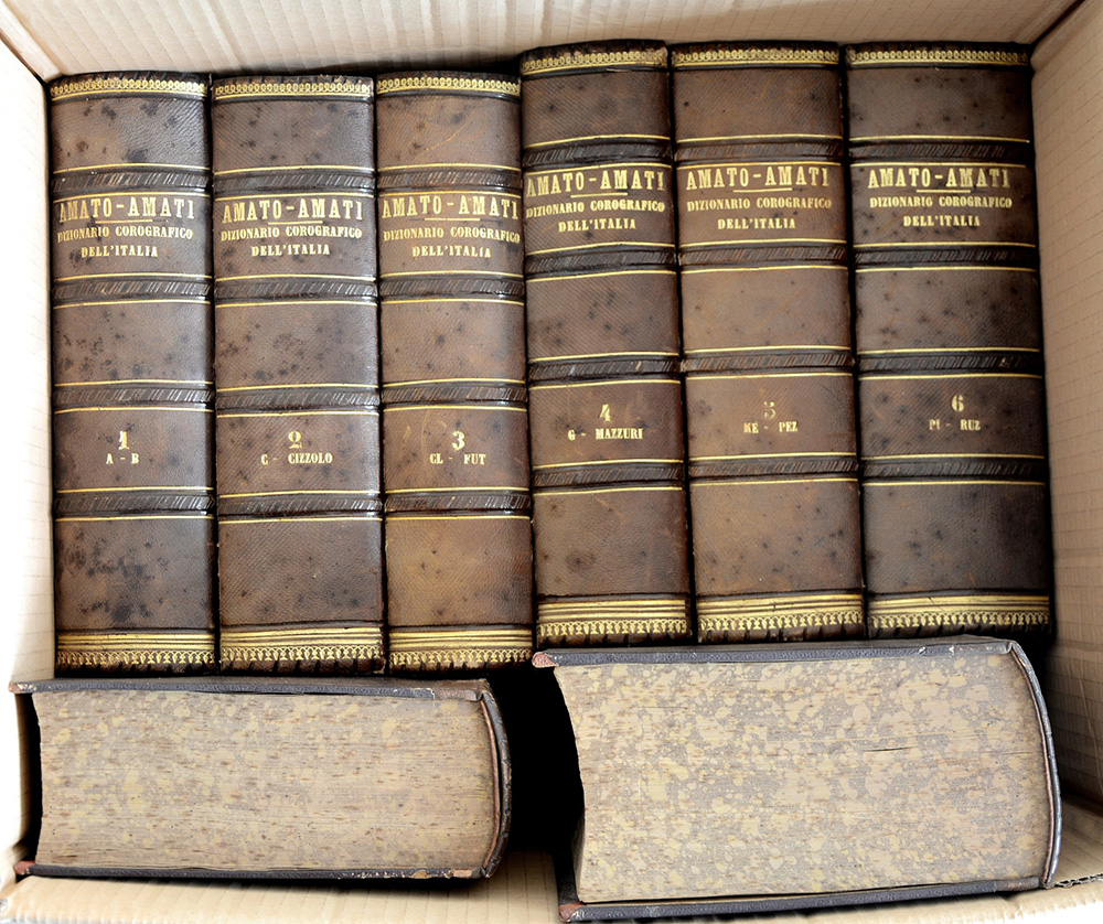(Libri) Amato Amati. Dizionario corografico dell'Italia... Milano, S.D. 8 voll. in 4∞. In mezza pelle. Lotto in cartone (difetti)