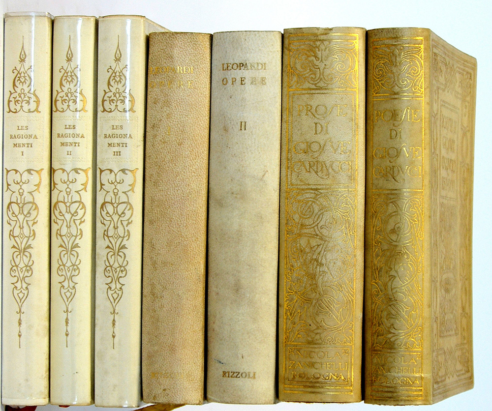 (Libri) Lotto di tre opere: Poesie di GiosuË Carducci. Bologna, 1927. 2 voll. In piena pergamena con fregi in oro. Giuseppe De Robertis (a cura di). Giacomo Leopardi. Opere. Milano-Roma, 1937. 2 voll. In piena pergamena con titolo in oro. Les Ragionamenti de l'Aretin. Paris, 1959. 3 voll. In piena tela. (lievi difetti)