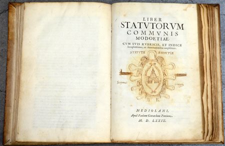 Liber Statutorum Communis Modoetiae... Mediolani, Typis fratrum de Camagnis prope rosam, 1682. Liber Statutorum Communis Modoetiae... Mediolani, apud Paulum Gottardum Pontium, 1579. Due opere in un unico volume. Legatura cartonata in mezza pergamena non coeva (difetti)