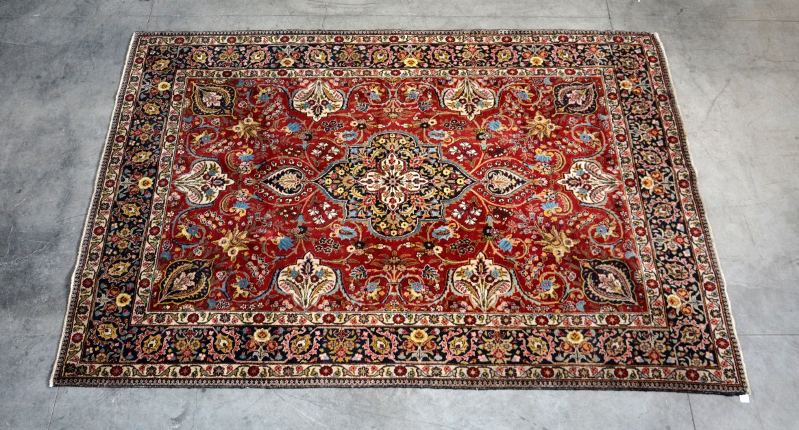 Tappeto Tappeto Tabriz, Persia secolo XX. Disegno a medaglione floreale su fondo rosso. (330x225) (difetti)