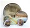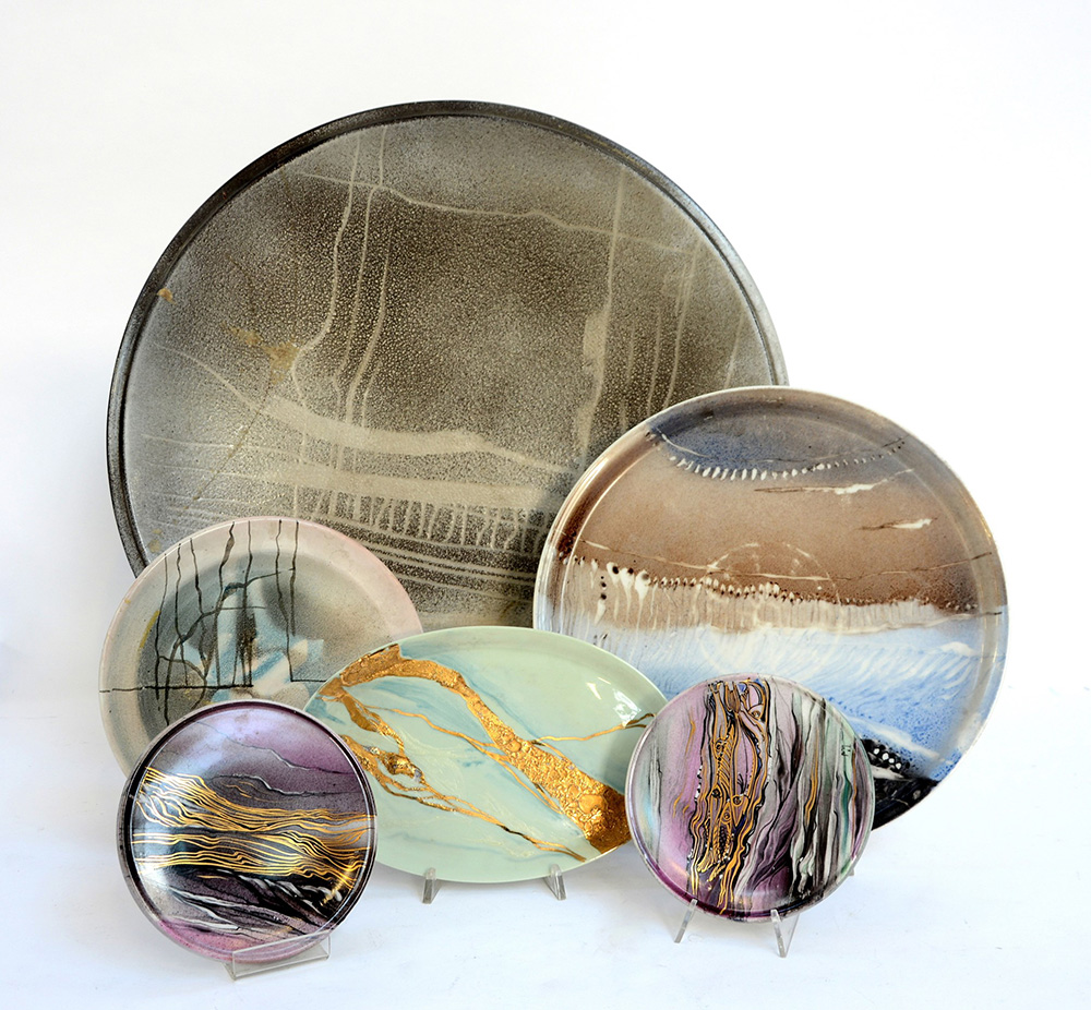 Locatelli Gabriella Lotto di sei piatti di misure e forme diverse in ceramica decorati in policromia e oro di cui uno recante monogramma della decoratrice (difetti)