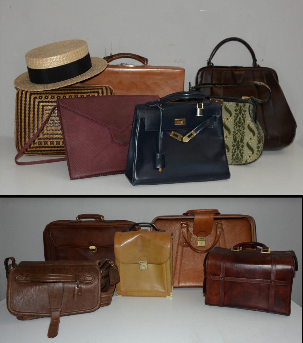 Lotto di due cartoni contenenti alcune borse da viaggio e da lavoro, borsette per signora e un cappello in paglia (difetti)