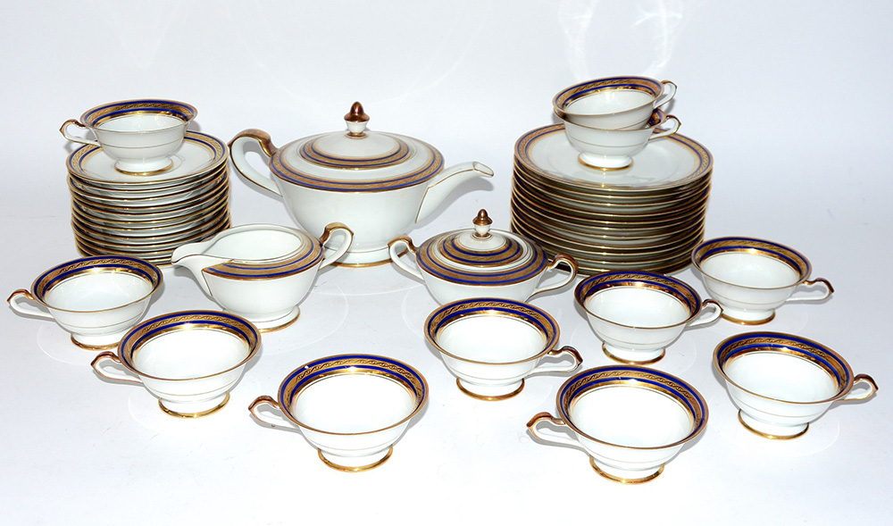 Manifattura di Eschenbach. Parte di servizio da tË in porcellana con bordura blu e dorata. Composto da teiera, lattiera, zuccheriera, tazzine con piattini e dodici piatti da dolce (difetti)