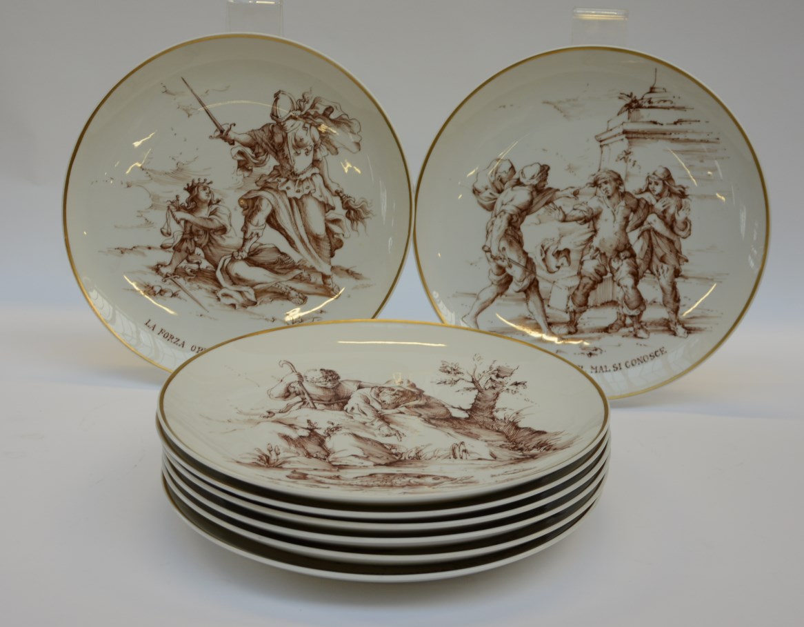 Gruppo di otto piatti in porcellana decorati in monocromia con figure e...