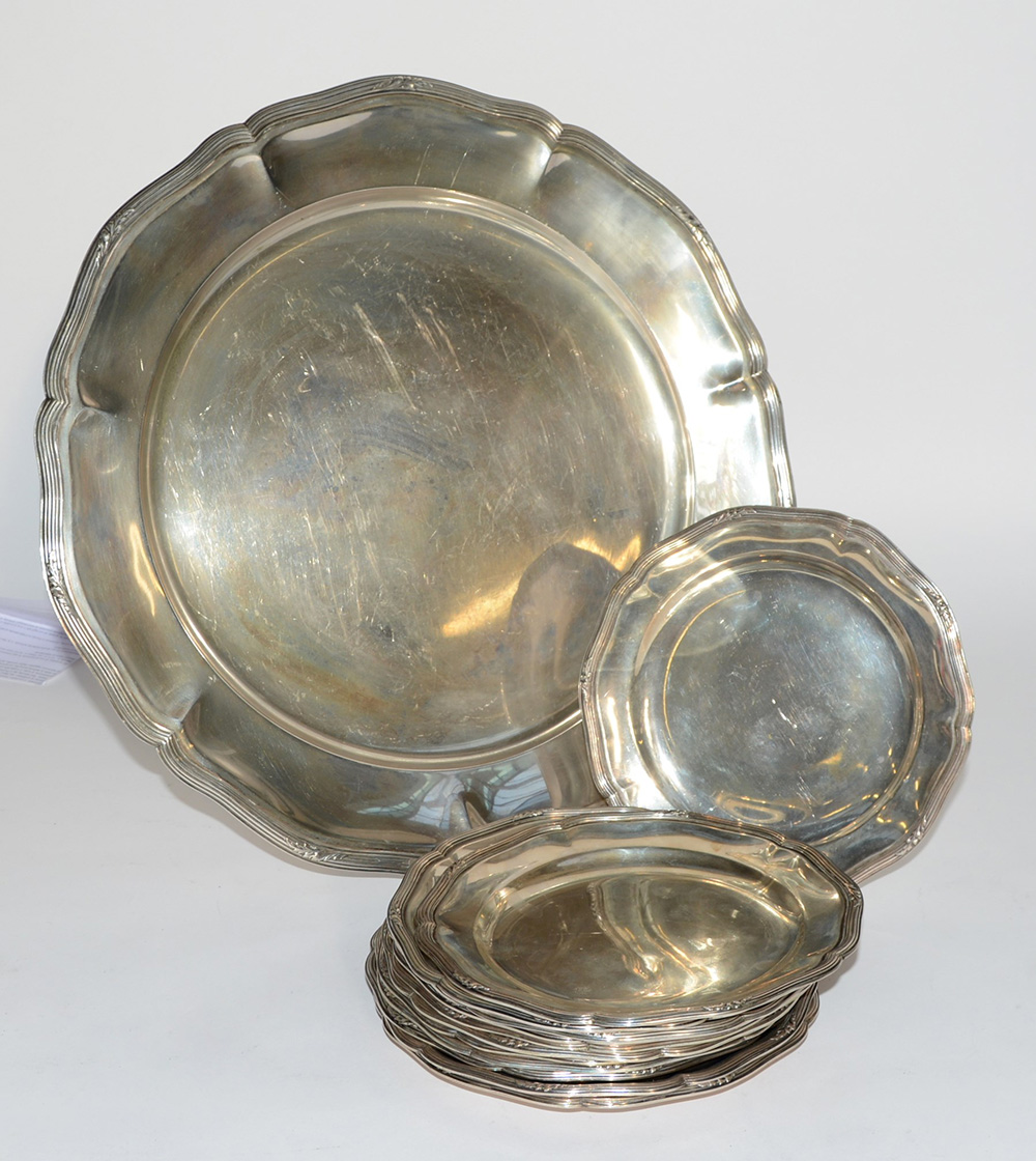 Lotto composto da un vassoio e dodici piatti in argento di forma circolare con bordura sagomata in stile impero. Italia, sec. XX (d cm 39,5 e 19 cm) (gr 3800 ca) (lievi difetti)