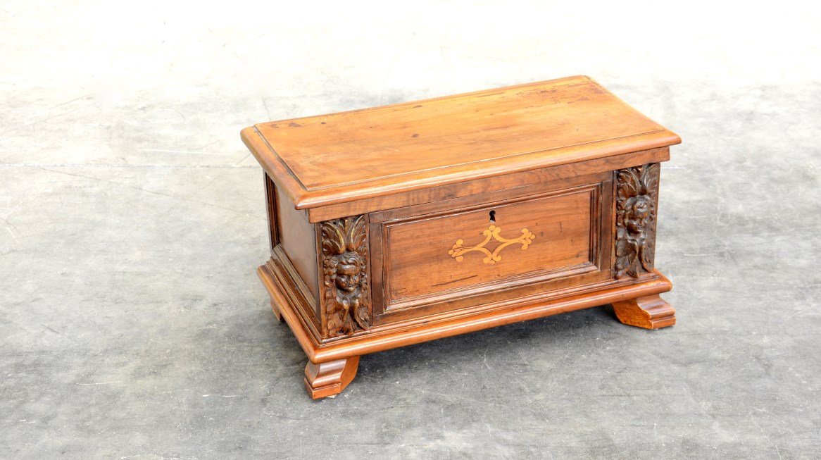 Antico forziere in noce con fronte intarsiato a volute e montanti scolpiti teste di cherubini (cm 52x26x26)