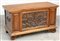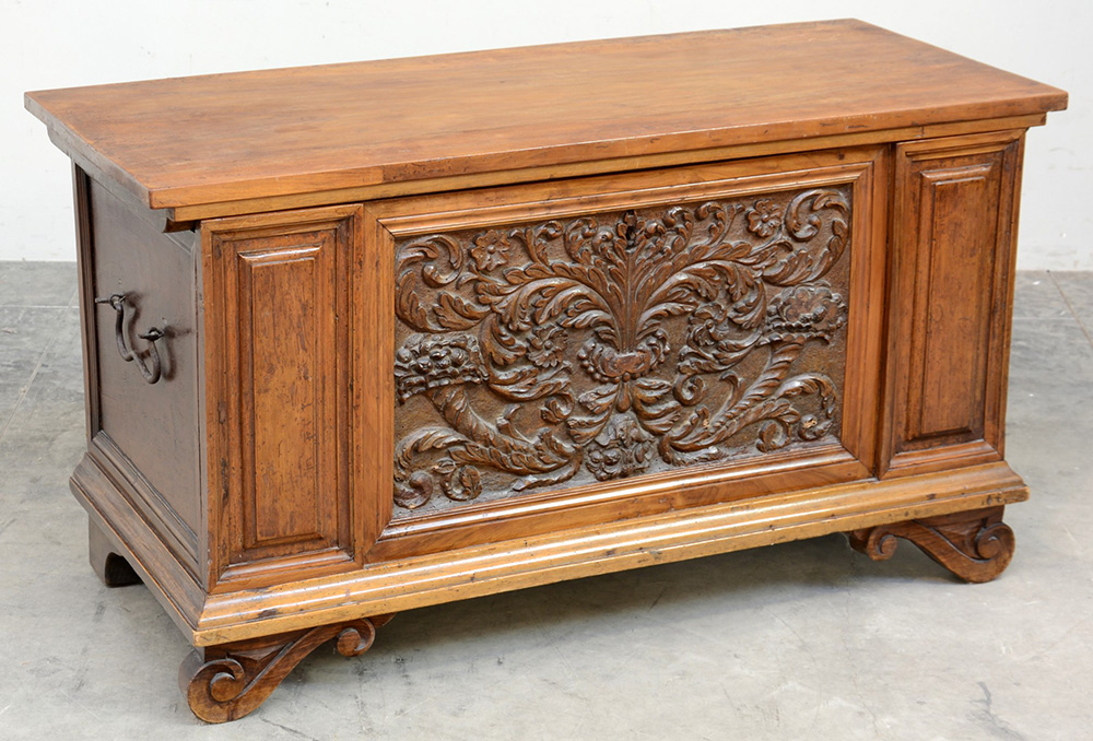 Cassapanca in noce con fronte scolpito a volute fogliate. Piedi ricciolo (cm 100x60x45)