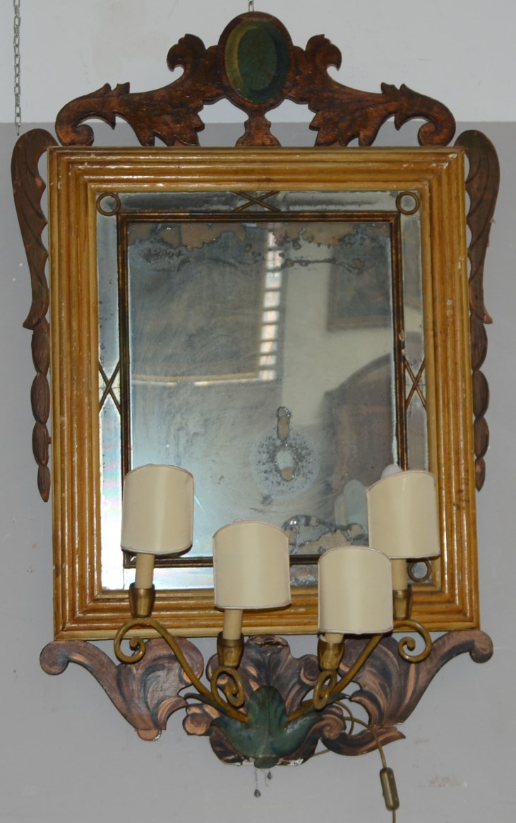 Specchio in legno laccato con fregi scolpiti a foglie. Portacandele in ferro...