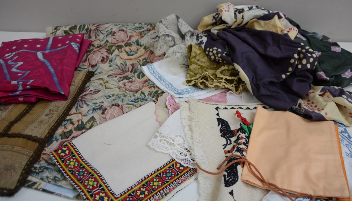 Lotto di due cartoni contenenti alcune sciarpe, guanti, scampoli di tessuto, tovagliette e merletti