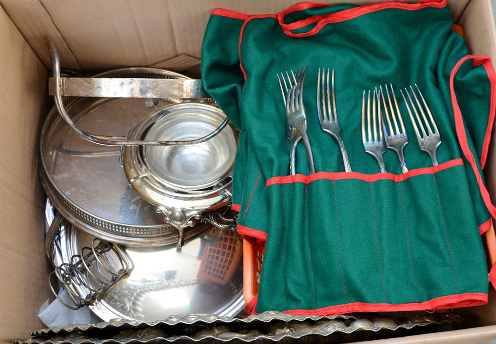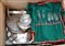 Cartone contenente numerosi oggetti e posate in metallo argentato