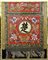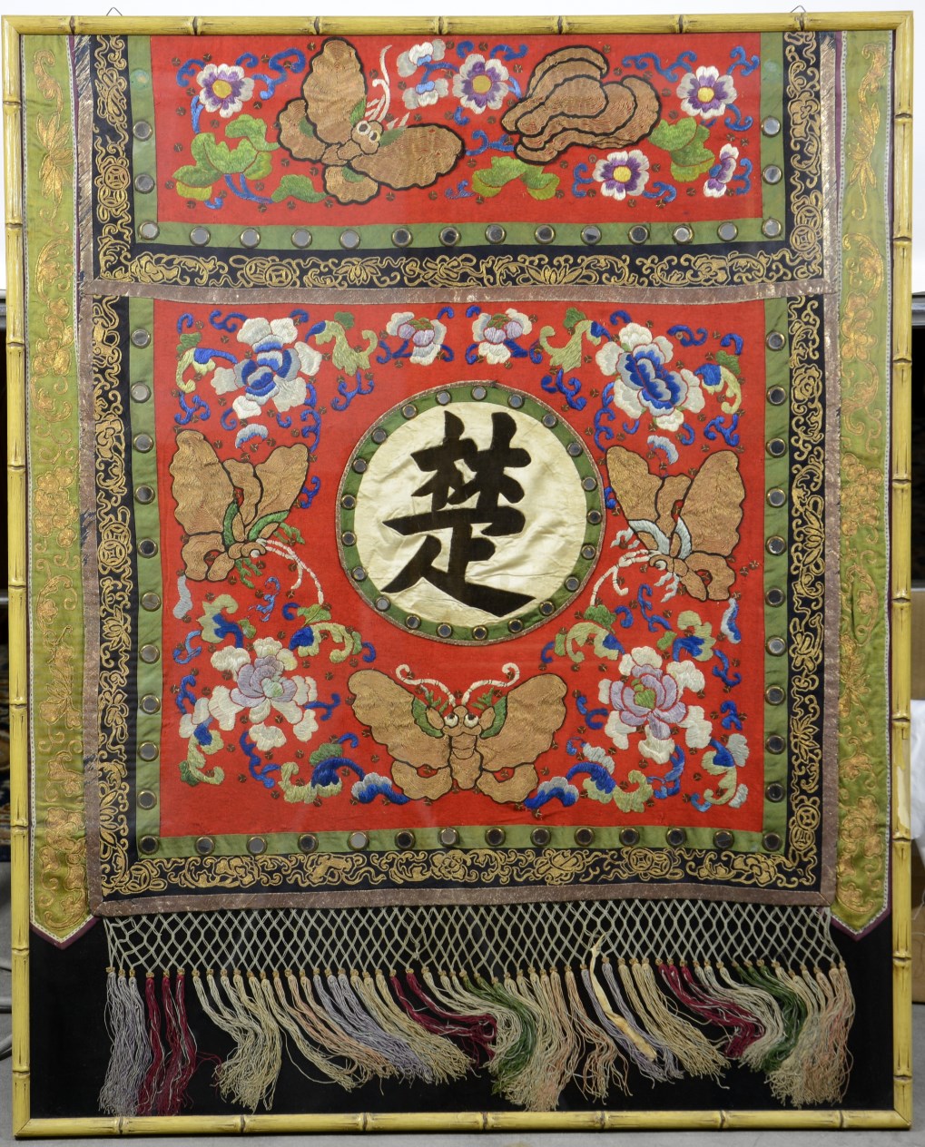Stendardo in seta ricamata in filo d'oro e policromo a farfalle, fiori e specchi con caratteri "Chu" al centro (cm 80x90) Cornice a guisa di bamb˘