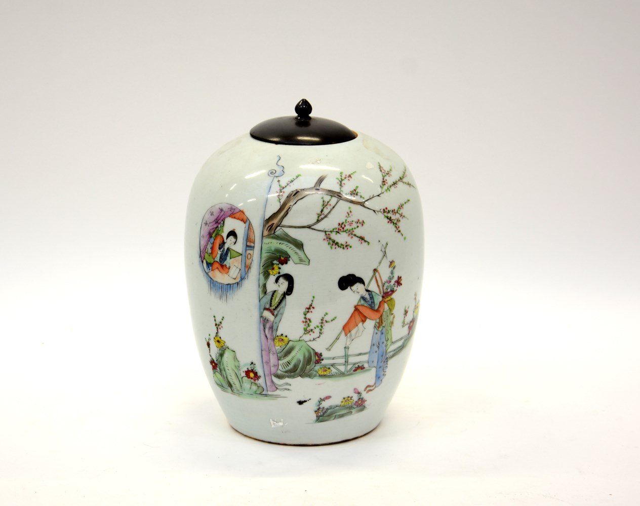 Arte cinese, sec. XX. Vaso in porcellana decorato in policromia con scene di vita. Coperchio in legno (h cm 29)
