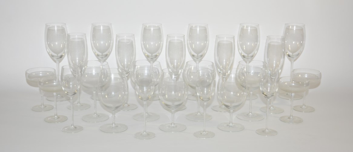 Servizio di bicchieri in vetro composto da sette bicchieri da vino bianco, sette da vino rosso, sette da acqua, sette da spumante, sette da champagne e cinque bicchieri da liquore.