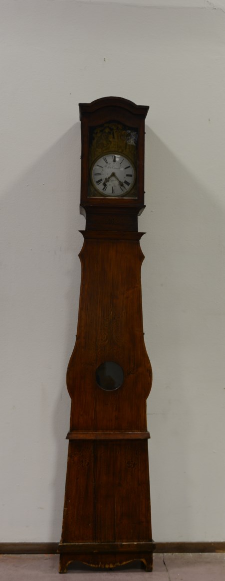 Pendola con cassa in legno laccata a motivi vegetali, quadrante in smalto a numeri romani decorato con fregi sbalzati con Susanna al pozzo. Movimento di tipo morbier. Firmata Min Camatte Grasse, Francia sec. XIX (difetti)