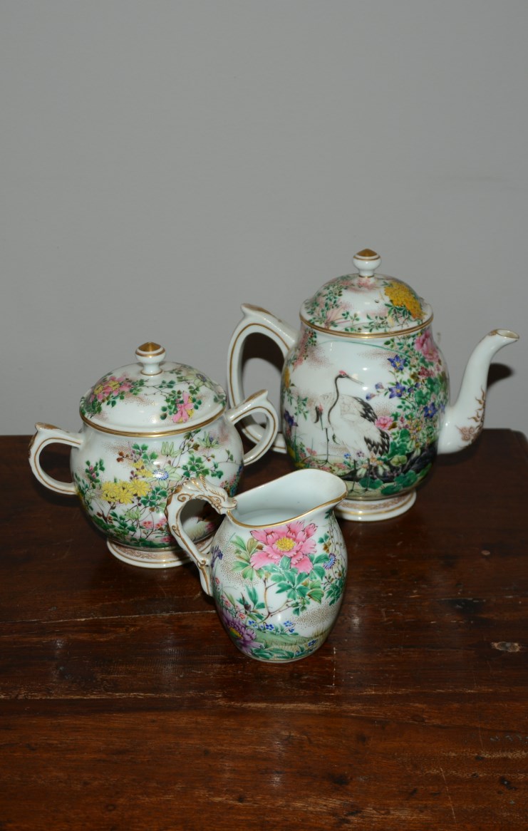 Manifattura giapponese, parte di servizio da tË in porcellana decorato in policromia a dorature a fiori e volatili, composto da lattiera, zuccheriere e teiera, marchio alla base