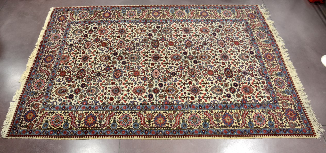 Tappeto Tabriz, Persia secolo XX. Disegno floreale policromo all-over su fondo bianco (336x228) (difetti)