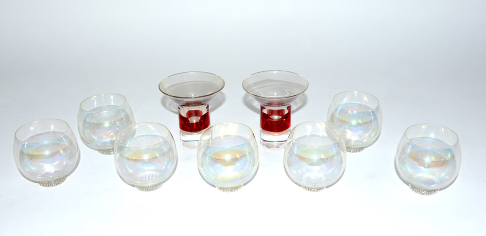 Manifatture diverse. Lotto composto da nove bicchieri in vetro incolore e rosso (difetti)