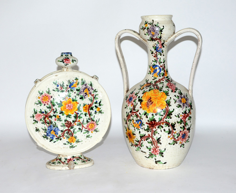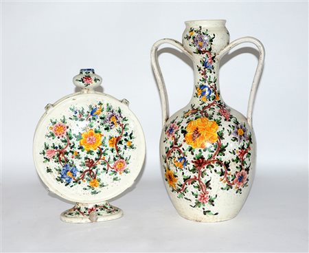 Manifattura C.A.M Gubbio. Lotto composto da due vasi biansati in ceramica decorati in policromia a fiori (difetti)